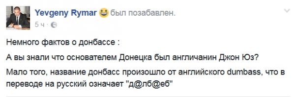 "Немного фактов о донбассе: А вы знали что основателем Донецка был англичанин Джон Юз? Мало того, название донбасс произошло от английского dumbass, что в переводе на русский означает "д@лб@еб", - написал Рымарь.