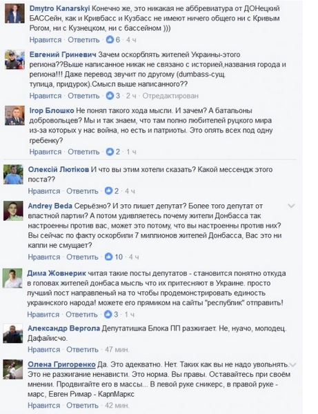 В комментарии к посту депутата пользователи соцсети отметили, что подобные заявления являются оскорбительными для жителей региона. Они подчеркнули, что слово "Донбасс" - производное от "Донецкого бассейна" залежей каменного угля.