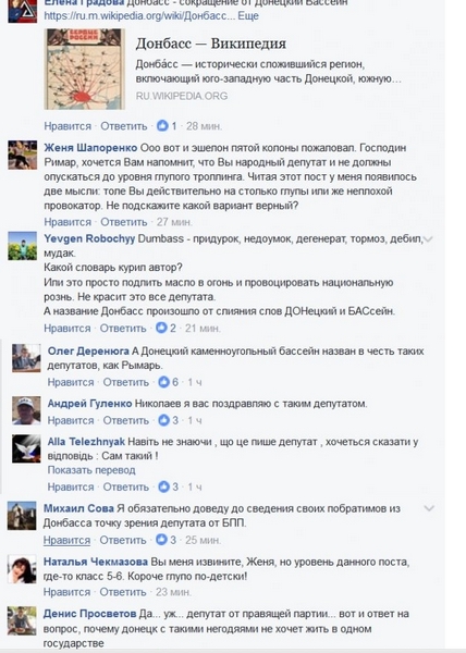 Депутат Николаевского городского совета от партии "Блок Петра Порошенко "Солидарность" Евгений Рымарь оскорбительно высказался о Донбассе, предположив, что название этого региона произошло от английского ругательства. Об этом он написал на своей странице в фейсбуке (на момент написания заметки пост был удален).