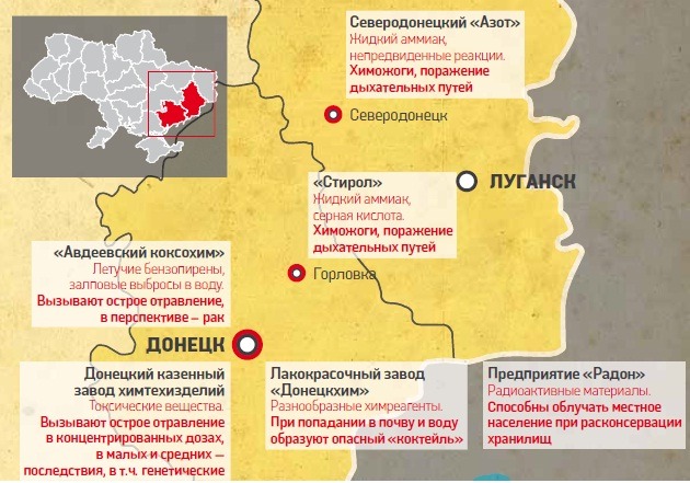 На территории одной только Донецкой области 3809 потенциально опасных предприятий. Каждое десятое имеет повышенный 1-й или 2-й класс опасности. 149 заводов связаны с химией. В Луганской области таковых чуть меньше. Но риск все равно велик.
