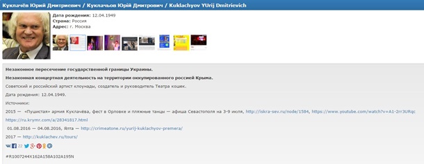 Известный российский дрессировщик кошек Юрий Куклачев попал в базу данных сайта Миротворец. Его данные появились на портале в понедельник, 22 мая.