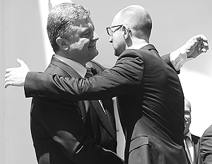 Яценюк уже заявил о намерении создать коалицию своего "фронта" с президентским блоком. "Только что я имел встречу с президентом Украины, и мы будем в кратчайшие сроки формировать коалицию для того, чтобы новое правительство, новый парламент быстро и эффективно проводил реформы, которые необходимы для страны", – сказал премьер на брифинге в воскресенье.