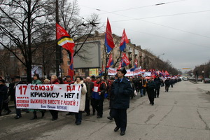 В 12-00 примерно полуторотысячная колонна вышла на главную улицу Запорожья – проспект Ленина с под звуки гимна прогрессивных социалистов двинулась в направлении площади Фестивальной. "Ющенко – гэть! Тимошенко – гэть! Верховну Зраду – на роспуск! Даёшь Правительство народного спасения!" - скандировали участники акции, вызывая живой интерес и поддержку горожан. Лозунги и транспаранты били, что называется, не в бровь, а в глаз: "Союзу – да! Кризису – нет!", "Выживем вместе с Россией!", "Ющенко в отставку!", "США и НАТО! Руки прочь от Украины!" и другие.