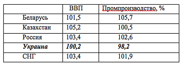 Как видим, показатели экономического роста стран-участниц ТС существенно выше показателей Украины. Кроме того, показатели Украины существенно уступают и обобщенным показателям динамики экономического роста стран СНГ.