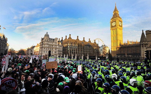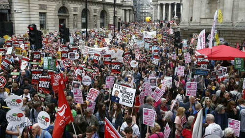 Страна которая вошла в Евросоюз, но не вошла в зону евро. Страна которая постоянно грозится выйти из Евросоюза и возможно предпримет этот шаг в 2017 году, после проведения всенародного референдума. Издалека Туманный Альбион кажется нам эталоном финансовой стабильности. Но и здесь не все так радужно. В июле 2014 года Англия погрузилась в общенациональную 24-х часовую забастовку, в которой приняло участие несколько сотен тысяч человек. Бастовали против низких зарплат и пенсий. И вот на днях, новый протест! Более 250 000 человек вышли на улицы Лондона 20 июня 2015 года. Англичане протестовали против антисоциальных решений правительства, урезания социальных программ и сокращения рабочих мест.