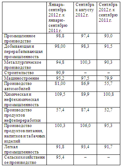 Пожалуйте для наглядности таблицу состояния промышленности и её основных составляющих элементов за 9 месяцев 2012 г. в сравнении с соответствующими периодами 2011 года – куда ведет нас тренд животворящий.