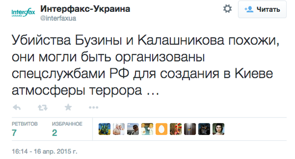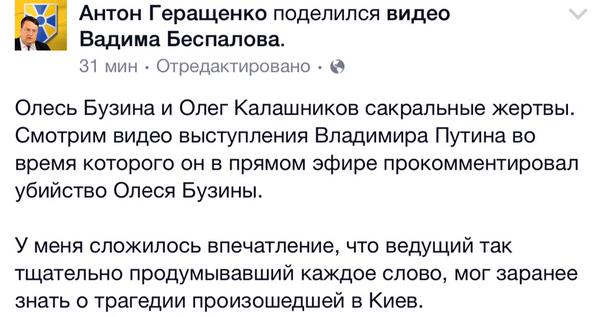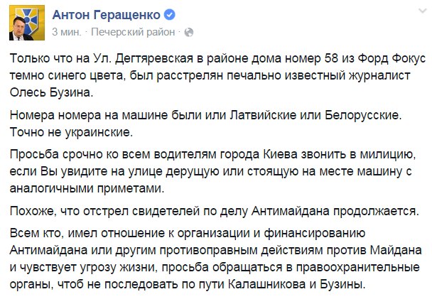 Не успела сойти с новостных строк тема убийства Калашникова, как приходит ещё более шокирующая новость. Убит известный писатель и журналист Олесь Бузина. И ещё до появления новости в сколь значимо крупных украинских СМИ, всё тот же Геращенко публикует у себя на странице официальное подтверждение убийства Бузины.