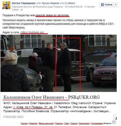 "Всем кто, имел отношение к организации и финансированию Антимайдана или другим противоправным действиям против Майдана и чувствует угрозу жизни, просьба обращаться в правоохранительные органы, чтоб не последовать по пути Калашникова и Бузины"