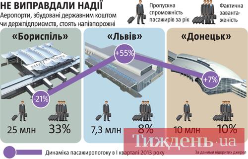 Донецкий аэропорт, как уверяли чиновники во время его строительства, должен стать транзитным узлом для стыковки рейсов из Европы в Азию. Год спустя сюда не только не спешат новые перевозчики, но и уходят старые, как Czech Airlines и польская авиакомпания LOT. Свое решение они мотивируют нерентабельностью рейсов: 3 июня на табло аэровокзала в Донецке высвечивалось лишь несколько десятков рейсов, в основном чартерных на турецкие и египетские курорты и оттуда. В январе - марте 2013 года аэропорт перевез 197 тыс. пассажиров, что лишь на 7% превышает прошлогодний показатель. Получается около 2,2 тыс. человек в сутки на аэровокзале, способного ежечасно принимать 3,1 тыс. человек.