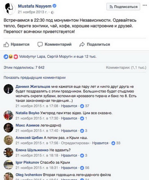Общепризнано, что евромайдан (не путать с «революцией гидности») начался 21 ноября 2013 года с поста в Facebook Мустафы Найема. Пост был откликом на новость о том, что Виктор Янукович не подпишет Соглашение об ассоциации между Украиной и ЕС на саммите Восточного партнерства в Вильнюсе 28-29 ноября. И состоял из трех предложений: "Встречаемся в 22:30 под монументом Независимости. Одевайтесь тепло, берите зонтики, чай, кофе, хорошее настроение и друзей. Перепост всячески приветствуется!".