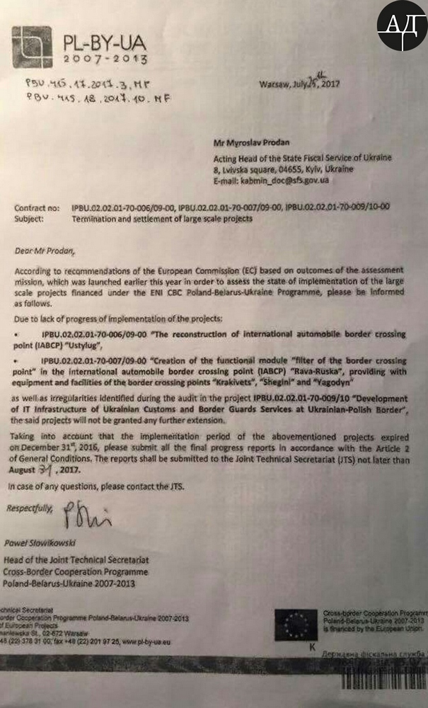 Европейский союз прекращает отношения с Украиной в рамках "Трансграничного сотрудничества PL-BY-UA" и разрывает программу финансирования трех приграничных проектов на 10 млн евро. Об этом сообщает журналист Александр Дубинский, публикуя соответствующее письмо главы программы Павел Словиковски на имя в.о. Главы ГФС Мирослава Продана.