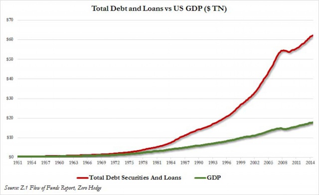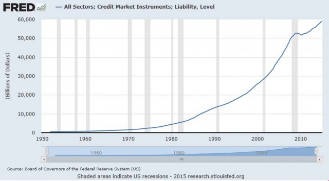 График "Общий размер инструментов кредитного рынка" (Total Credit Market Instruments), который был опубликован еще 31 марта 2015 г. на основе данных ФРС США, наделал много шума, ведь оказалось, что этот показатель, подразумевающий общий долг США, превысил $59 трлн, то есть 330% ВВП США.