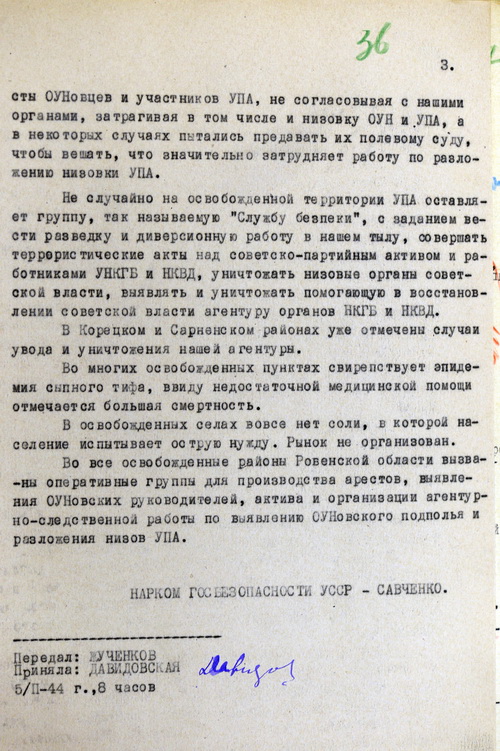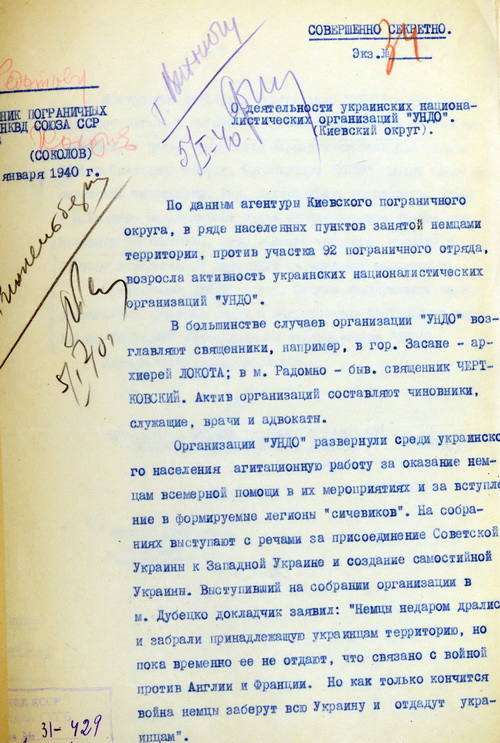 Архивные документы с сообщением ГУПВ НКВД СССР об активизации деятельности Украинских националистических организаций (УНДО) во время Второй мировой войны на территории Украины и приграничных территориях с Польшей.