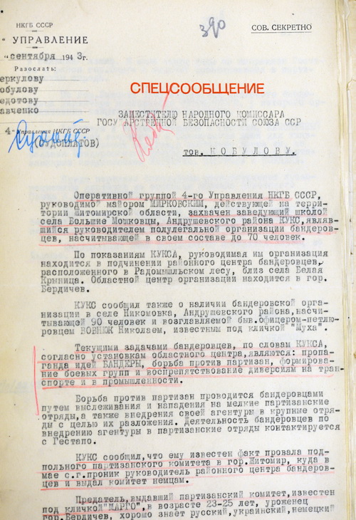 Архивные документы со спецсообщением 3 отдела 4 Управления НКГБ УССР в НКГБ СССР о захвате одного из главарей украинских националистов Кукса, во время Второй мировой войны в Житомирской области.