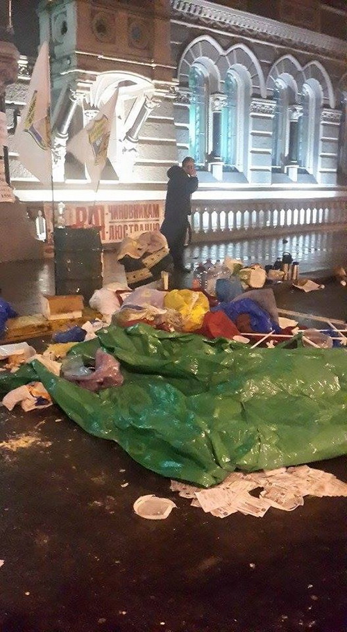 Милиция, заявляя о нарушении правил благоустройства, снесла палатки протестующих возле здания Нацбанка, предупредив, что в случае сопротивления будет открывать огонь. При этом улица Институтская была заранее заблокирована правоохранителями.
