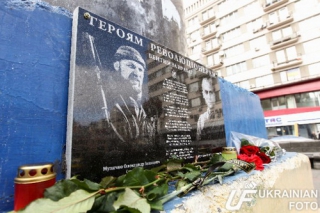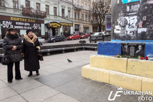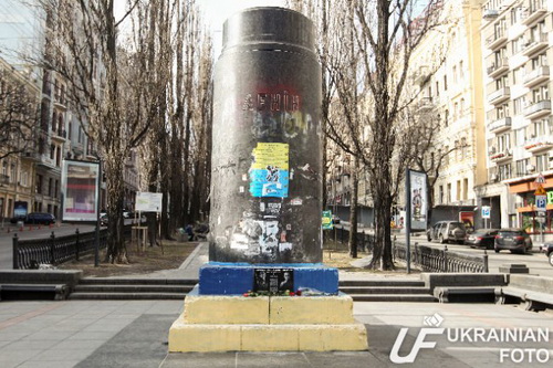 В центре Киева на бульваре Шевченко на постаменте снесенного памятника Ленину националисты установили мемориальную табличку памяти убитого Александра Музычко (Саши Белого) и Олега Мужчиля (Лесника).