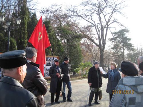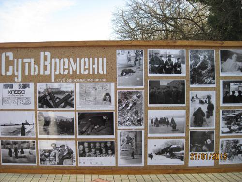 Сегодня, в канун 69-ой годовщины снятия блокады с города-твердыни на Неве, в городе-герое Севастополе активисты общественной организации "Суть времени - Крым", Прогрессивной социалистической партии Украины, Союзного движения "17 МАРТА", Союза рабочих Севастополя, общественных организаций "Дети войны Севастополя" и "Дар жизни", Партии "Киевская Русь" провели информационный пикет и фотовыставку. Организаторы мероприятия раздавали севастопольцам и гостям города листовки и газеты. Под Знаменем Победы севастопольские поэтессы Анна Цысарь и житель блокадного Ленинграда Лидия Давыдова читали свои стихи о Ленинграде, о войне, о Подвиге советского народа, о предательстве иуд, расчленивших нашу Великую Родину.