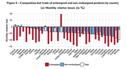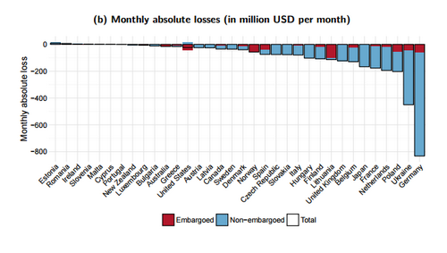 Французы комментируют, что Европейский союз несет 76,7% всех торговых потерь торговли и 78,1% не подпадающих под действие эмбарго продукции. Норвегия и Австралия потеряли до 45% от прогнозируемых потоков. Германия в среднем теряет более $832 млн в месяц (27%), в то время как другие крупные геополитические игроки гораздо меньше: Соединенные Штаты (0,4%), Франция (5,6%) и Соединенное Королевство (4,1%). Источник: