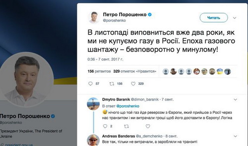 В своем «твиттере» он также отметил: "В ноябре исполнится уже два года, как мы не покупаем газ у России. Эпоха газового шантажа – безвозвратно в прошлом!".