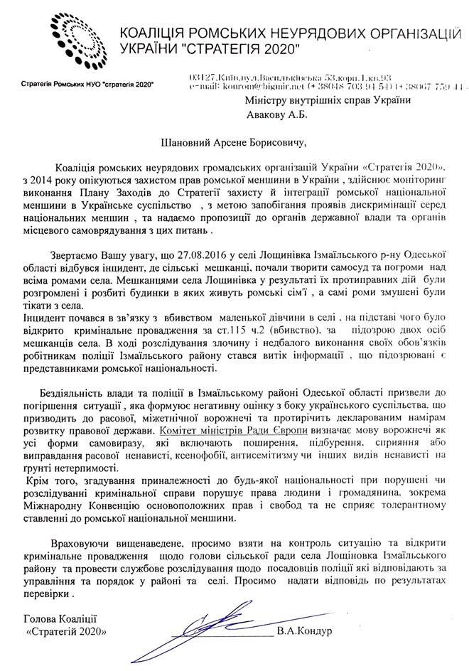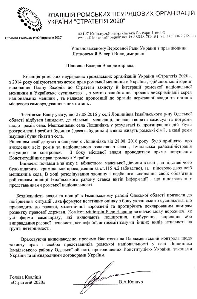 "Жителями Лощиновки в результате противоправных действий были разгромлены и разбиты дома, в которых живут цыганские семьи, а сами ромы вынуждены были бежать из села. Бездействие власти и полиции Измаильского района привели к такой ситуации, которая формует негативную оценку со стороны украинского общества, что приводит к расовой, межэтнической розни и противоречит декларируемым намерениям развития правового государства", - говорится в письме.