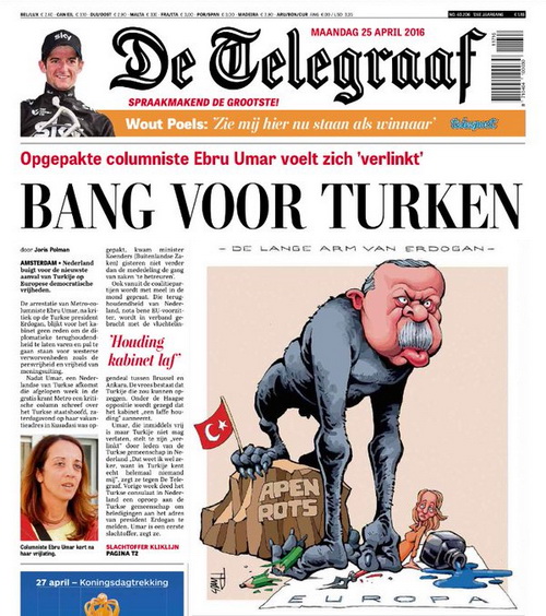 Популярная голландская газета De Telegraaf опубликовала карикатуру на президента Турции Реджепа Эрдогана после того, как турецкая полиция задержала их коллегу из газеты Metro.