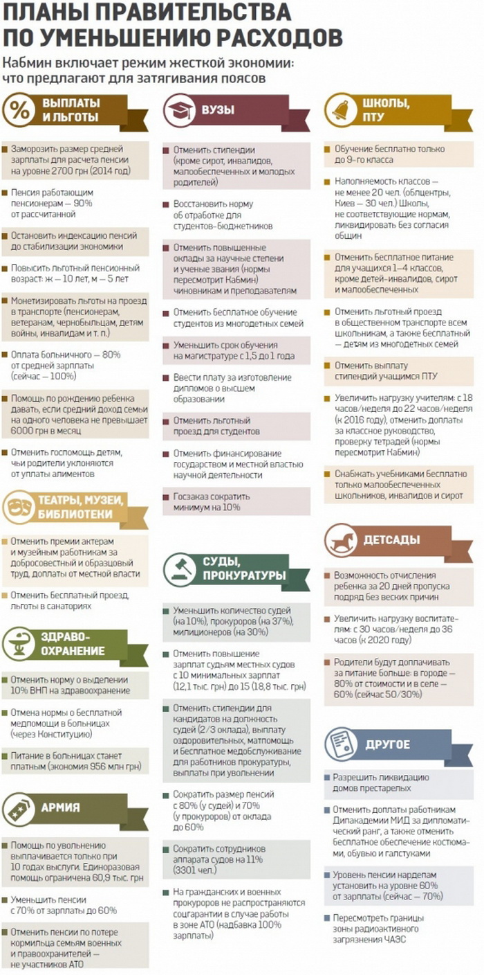 Копии документа с реквизитами Кабмина о планах по внедрению "экономной экономики" показал на своем сайте журналист Анатолий Шарий. На 46 листах прописаны предложения правительства о резком сокращении соцвыплат, монетизации льгот, экономии на здравоохранении и образовании - от заморозки пенсий и большинства соцвыплат на уровне 2014 года (а по некоторым позициям и сокращения за счет ликвидации надбавок), вплоть до экономии на "державных" костюмах и галстуках для дипломатов.
