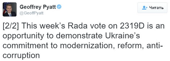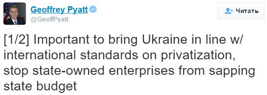 Джеффри Пайетт, американский посол на Украине, заявил о необходимости принятия закона о приватизации в этой стране, который даст возможность провести отчуждение активов крупных государственных предприятий.