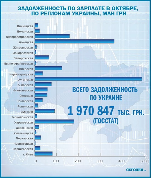 В октябре задолженность по заработным платам в Украине составила 1970 млн гривен. В январе этот показатель составлял 1320 млн гривен – таким образом, за год задолженность выросла на 50%.