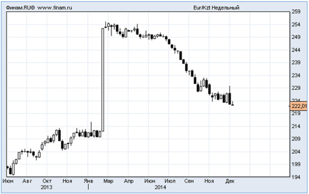 График 9. Курс тенге к евро после девальвации в марте 2014 года укрепился и близок к своим значениям до девальвации. Источник: