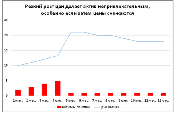 После взлёта цен, объемы покупок резко сокращаются. Мысли покупателя примерно таковы: "Не успел купить вовремя. Цены теперь будут падать (вариант: расти не будут), можно с покупкой не торопиться". Именно такая ситуация возникла в описанном выше случаем с резким повышением цен компанией КАМАЗ на свои самосвалы.
