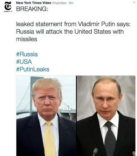 По утверждению сообщения в соцсети Twitter в микроблоге New York Times, Россия нанесет ракетный удар по Соединенным Штатам. Позднее в микроблоге было опубликовано сообщение о несанкционированном проникновении.