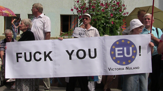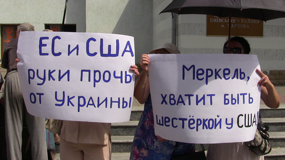Также участники акции протеста держали в руках плакат с надписью "Fuck You,EU!", которым напомнили высказывание помощника государственного секретаря США Виктории Нуланд и призвали Германию, в частности Меркель, не идти на поводу у американцев, которые стремятся разрушить экономические отношения между Россией и Евросоюзом, используя в своих геополитических целях Украину.