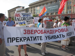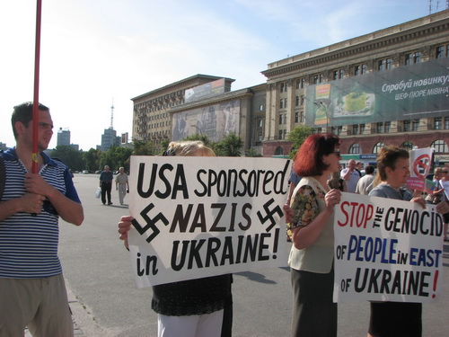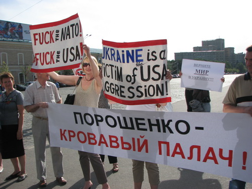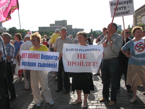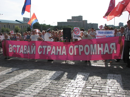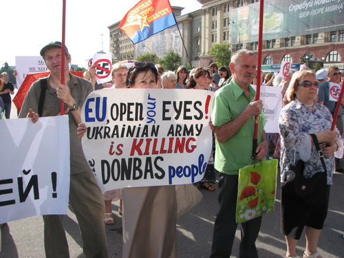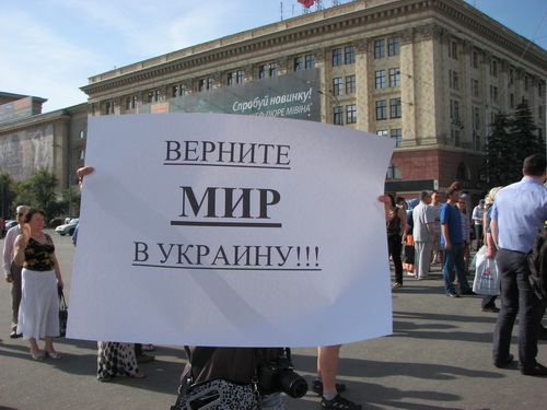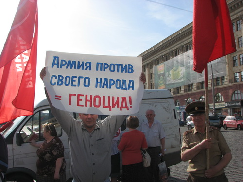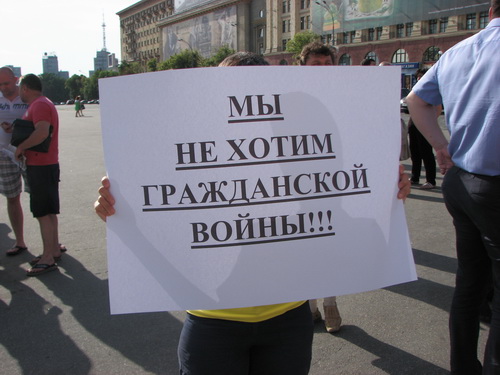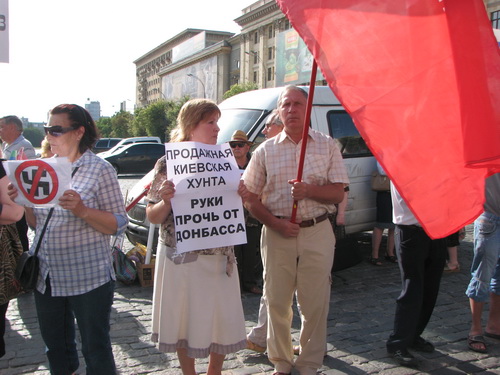 Пятого июня в Харькове состоялась очередная акция харьковчан, протестующих против войны, развязанной хунтой против народа Востока Украины. На площади Свободы собрались несколько сотен жителей Харькова, чтобы выразить свой протест против творящегося преступления. Прозвучали гневные выступления против карательной акции, которую затеяла новая власть против протестующего населения. Кровавый режим не ограничился убийством сотни людей на Майдане и решил кровью залить всю восточную часть Украины. Погибли уже тысячи людей, большинство которых безоружные простые граждане, целые населенные пункты подвергнуты разрушениям. Кровожадные убийцы организовали бомбометание по центру Донецка.