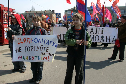 Символично, что впереди колонны митингующих шли дети. Которые несли плакат "Дяді-олігархи, не торгуйте нашим майбутнім". Хочется отметить, что в этой акции приняло участие много молодежи.