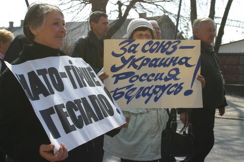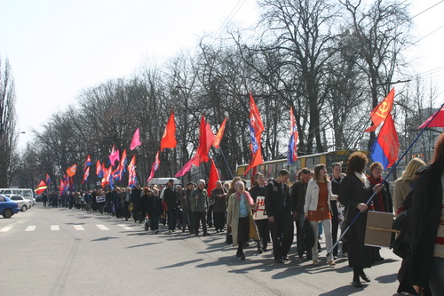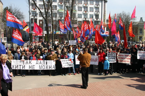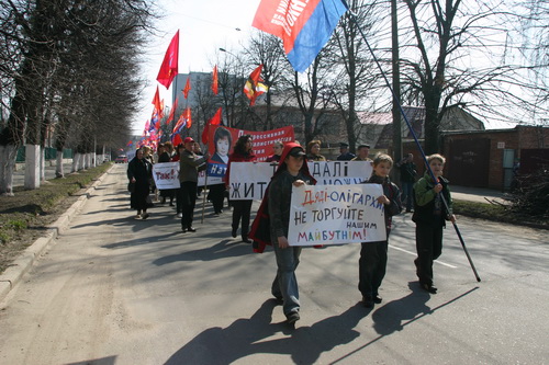 Протестующие под флагами ПСПУ, партии "Киевская Русь", КПУ, СПУ собрались в сквере им. Б.Хмельницкого, откуда колонна направилась на площадь к кинотеатру им. Шевченко. Участники акции скандировали: "Ющенко и Тимошенко – в отставку!", "НАТО - нет, Союзу – да!", "Мы не янки, мы славяне – наши братья россияне, мы не янки, мы не трусы – наши братья - белорусы", несли плакаты "НІ – голодомору - 2009", "Народ України - за Союз з Росією та Білоруссю", "Ні – росту цін", "Ні - безробіттю", "НАТО гірше гестапо", "Хочу їсти продукти без ГМО", "Ні – розкраданню землі, землю - селянам" и др.