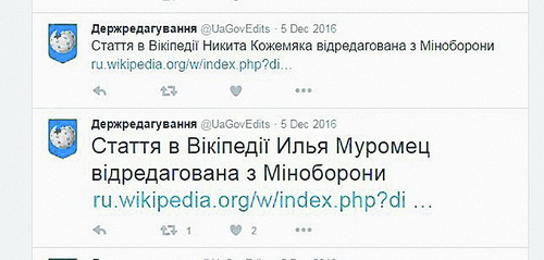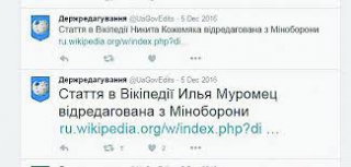Но нередко ведомства втягиваются в настоящие идеологические войны. Так в Минобороны весь декабрь 2016 года в статье об Илье Муромце доказывали приоритетность версии о его происхождении из села под Черниговом, а не из Владимирской области России (как настаивает российская «Вики»). Внесли суммарно около полутора десятка правок. Возможно, это связано с грядущей премьерой первого украинского фэнтези-фильма о супергероях "Сторожевая застава", который создавался под эгидой Госкино. Там тоже отстаивается версия о том, что русские богатыри на самом деле родом из Украины.