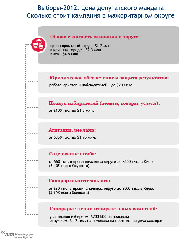 По мнению ряда экспертов, может стать самой дорогой за всю историю парламентских выборов Украине. На последних выборах по смешанной системе в 2002 году округ обходился кандидату-мажоритарщику в $200-300 тыс. "Тратят больше, чем раньше. Основная ставка делается на подкуп и рекламу", - резюмирует Березовец нынешние выборы, на которых стоимость мандата в провинциальном округе обойдется в $1-2 млн., в крупном городе - в $2-3 млн., а в столице и того больше - в $4-5 млн.