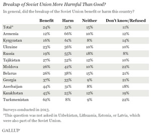 Только в трех из этих республик - Азербайджане, Казахстане и Туркмении - большинство считает, что выгод от распада СССР получили больше. В Грузии мнения разделились примерно поровну. Большинство же жителей Армении, Белоруссии, Киргизии, Молдавии, России, Таджикистана и Украины видят в распаде СССР больше минусов.