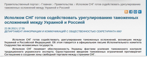 Данные о том, что исполнительный орган СНГ якобы высказал свою реакцию на действия таможенников России, ранее опубликовал украинский Кабмин (текст был выложен на сайте правительства, его также распространил ряд украинских СМИ).