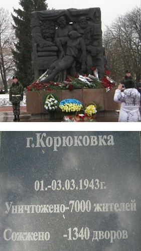 Объектом особого внимания лжеисториков стала Корюковская трагедия, которая была сотворена оккупантами в первых числах марта 1943 года. Одержимые неуёмной жаждой крови и мести гитлеровские головорезы учинили одно из самых массовых за годы Второй мировой войны одноразовое истребление мирных жителей. Здесь, в райцентре, они расстреляли и сожгли живьем около 7000 человек, уничтожили 1340 зданий и строений, превратив райцентр в город-кладбище.