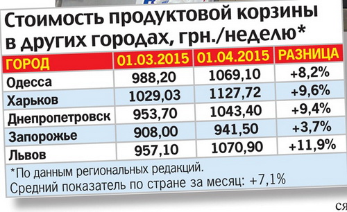 В 1043 грн. теперь обойдется корзина в Днепропетровске, который совершенно неожиданно удержал свое второе место по дешевизне после Запорожья. В марте в местных супермаркетах в очередной раз подорожало все: молочные продукты, сливочное и подсолнечное масло, макаронные изделия, мясо, рыба, овощи, хлеб. Яйца уже продаются по 20 грн. за десяток, сало - по 68 грн., куриное филе - по 60 грн. за кило. В целом подорожание составило 9,4%.