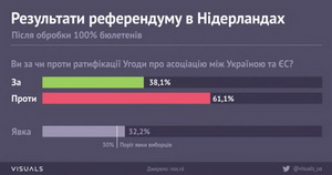 Против соглашения об ассоциации ЕС с Украиной проголосовали 61,1 процента принявших участие в референдуме, «за» - 38,1 процента. 0,8 процента бюллетеней признаны недействительными. Явка составила 32,2 процента, что при минимальном пороге в 30 процентов позволяет считать референдум состоявшимся.