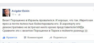 «Визит Порошенко в Израиль провалился, - написал на своей странице в Facebook известный израильский публицист и общественный деятель Авигдор Эскин. - И хорошо, что так. Ивритская пресса почти полностью бойкотировала его. В аэропорту его демонстративно не встречал никто кроме представителя МИДа. Сравните это с визитом Порошенки в Париж и поймете разницу».