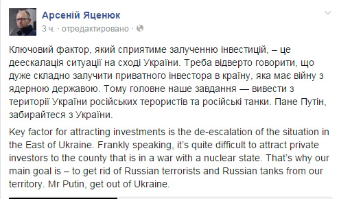 "Господин Путин, убирайтесь из Украины", - вызывающе отчеканил Яценюк в соцсети, совершенно наплевав на директивы западных партнеров, прямо указавших, что главная проблема Украины отнюдь не Путин.