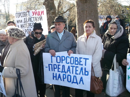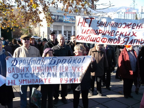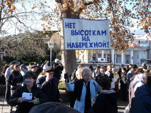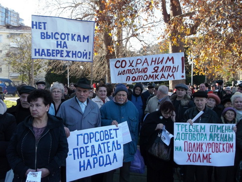 3 января на площади Советской перед зданием Ялтинского горисполкома было многолюдно. Сотни неравнодушных местных жителей пришли, чтобы высказать свою позицию по поводу будущего своего города. События 2012 года: попытка закрытия зубной поликлиники, закрытие вечерней школы, опытно-производственной базы НИВиВ "Магарач", защита Поликуровского холма против вооруженных до зубов охранников фирмы "Центурион-Элит" и представителей фирмы-застройщика ООО "Аль" и ООО "Строительная фирма "Триумф" - стали последними каплями, переполнившими чашу терпения ялтинцев. Именно на этот день были назначены общественные слушания по вопросу застройки Поликуровского холма, а также презентация инвестиционного договора N24/12 от 19.09.2012 (подписанного ещё мэром Ялты А.В. Боярчуком), согласно которому будет "реконструирован" знаменитый фонтан в центре Набережной "Купальщица". Однако, эта "реконструкция" подразумевает многоэтажное строительство ресторанно-торгового комплекса с подземной парковкой, что однозначно изменит облик сквера им. Некрасова, повредит знаменитому вековому платану и циркуляции воздушных потоков, приносящих прохладу с гор на Набережную в жаркие летние дни. Многие отмечали, что исторический центр Ялты и так уже пострадал от строительства бетонных монстров (рядом с гостиницей "Ореанда", на пересечении улиц Пушкинской и Боткинской, на месте бывшей столовой "Бригантина", на месте бывшего магазина "Океан", в районе бывшего кинотеатра "Октябрь", Эдинбург-Тауэр и др.). Известно, что были даже планы строительства 26-этажного комплекса на месте кинотеатра "Сатурн" на площади Советской, а также странный пожар, унесший жизни двух охранников... И после гибели людей "Сатурн" пока не трогают. Зато снесено здание цирка, на месте которого уже ускоренными темпами строят очередную высотку, так и не открыли обещанный детский сад в здании уничтоженной вечерней школы и не открыли обещанный детский сад и в здании уничтоженного Дома малютки. Стоят не заселёнными, с тёмными окнами, многоквартирные дома, которые строились явно не для ялтинцев6, начала облетать "косметика" с реконструированного и открываемого несколько раз в том числе и президентом Ялтинского роддома.