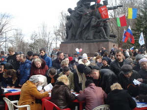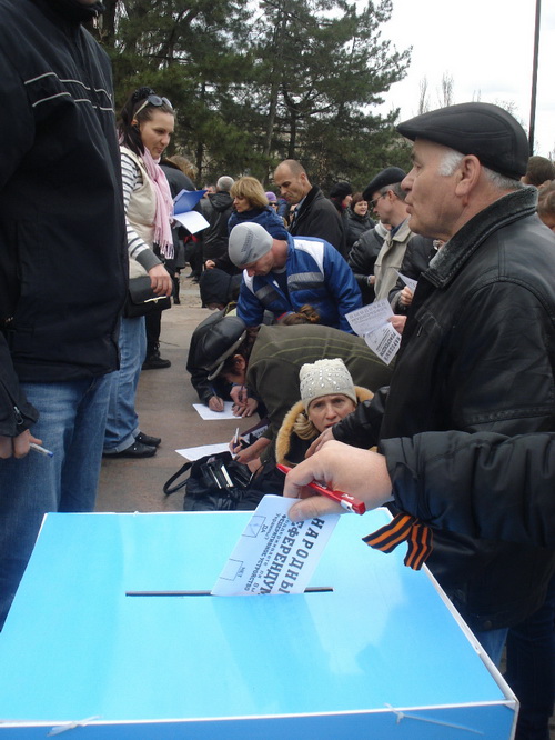 РОВНО В 12:00 на площади у мемориального комплекса воинов-десантников Константина Ольшанского начался обещанный "народный референдум", который продлился до 17.00 ,но люди продолжали идти ....говоря о том, что только узнали об этом , из "вражеских телеканалов" .Всё делалось властью для того, чтобы сорвать это мероприятие. О том, что были запрещены все мероприятия и акций больше не проводится, вещали с местных телеканалов и местных интернет изданий, но то что были поданы заявки и дальше, которые никто не запретил ,нигде не говорилось. Народ поверил ,но самые стойкие всё же пришли !!!