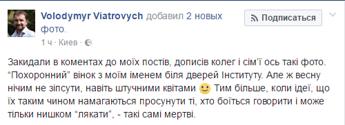 Об этом в Facebook написал директор Украинского института национальной памяти Владимир Вятрович. "Похоронный венок с моим именем возле дверей Института. Но весну ничем не испортить, даже искусственными цветами", - написал он.