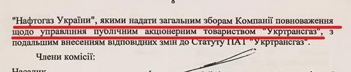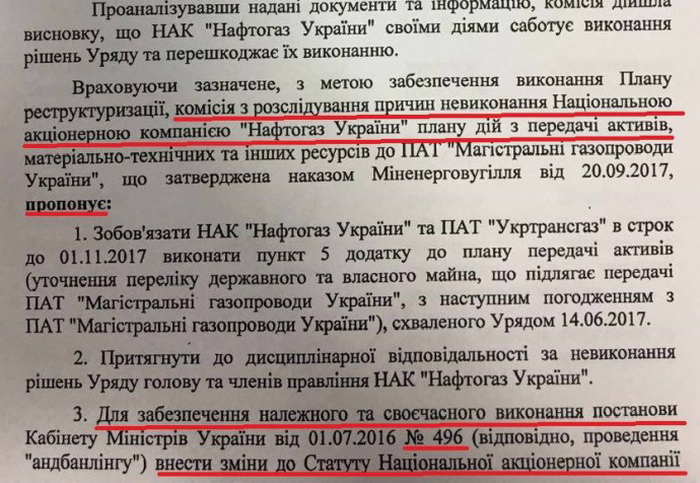 Цим документом прописана передача активів підконтрольного "Нафтогазу" "Укртрансгазу" незалежним від нього держкомпаніям ПАТ "Магістральні газопроводи України" (в її ведення мала бути передана трубопровідна інфраструктура) і ПАТ "Підземні сховища газу" (передані підземні газосховища). У той час як в "Нафтогазі" запланували передачу цього майна в новостворену філію "Укртрансгазу" - компанію "Оператор ГТС України".