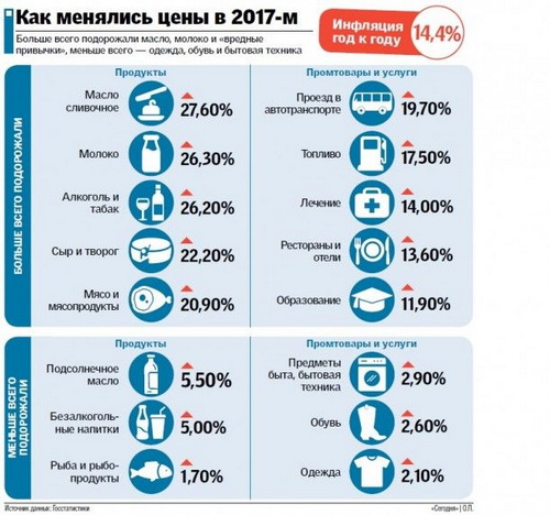 Инфляция по итогам 2017 года более чем в 1,7 раза превысила прогнозную и составила 14,4% из расчета год к году, подсчитала Госслужба статистики. Если сравнивать декабрь 2017 и 2016 годов, цены выросли меньше - на 13,7%. Среди лидеров по подорожанию - свинина, молоко, масло, спиртное и сигареты, а из промтоваров - топливо. Эксперты обещают в 2018 году дальнейший рост цен на эти позиции, хотя он и должен быть меньше, чем год назад, так как цены на них уже сравнялись с европейскими либо близки к ним.