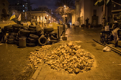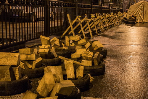 По словам жителей лагеря, они готовы к неожиданным нападениям извне. По периметру городка поставили забор и построили баррикады. Митингующие разобрали брусчатку и сложили в кучи, принесли шины, входы огородили деревянными конструкциями с колючей проволокой. Под одним из заборов мы увидели несколько щитов, которые, как сообщили жители лагеря, удалось отбить у полицейских во время стычек.